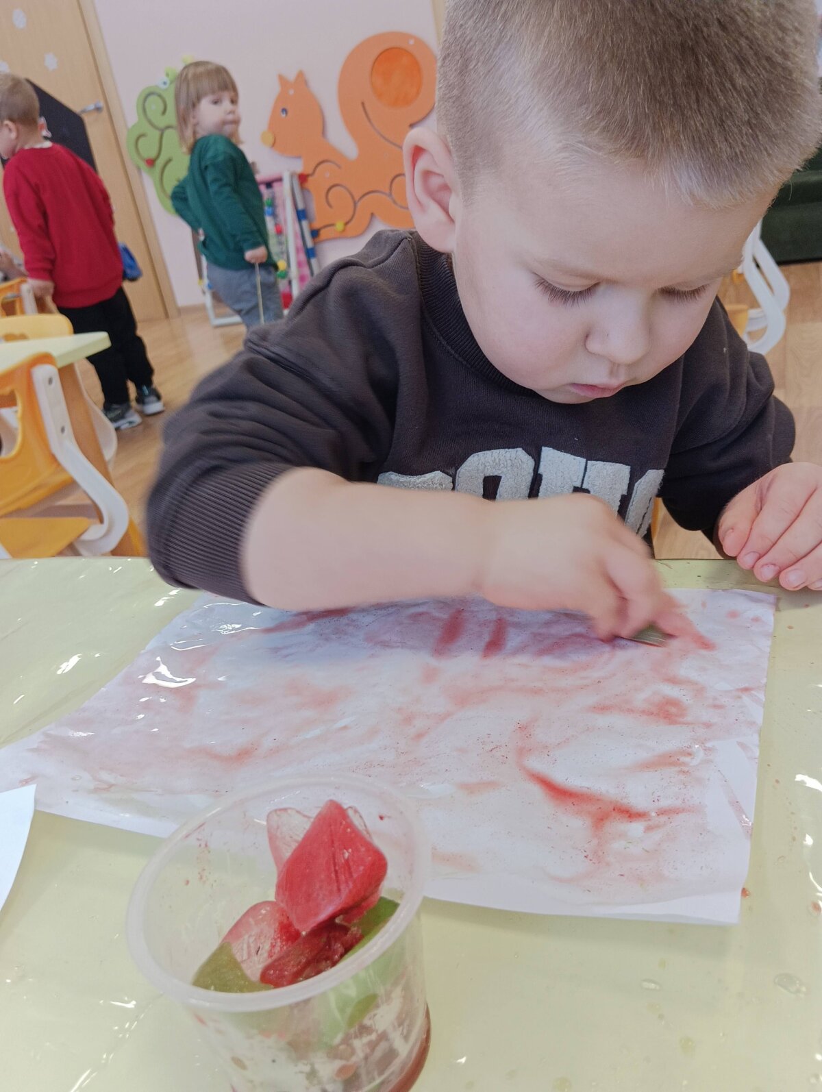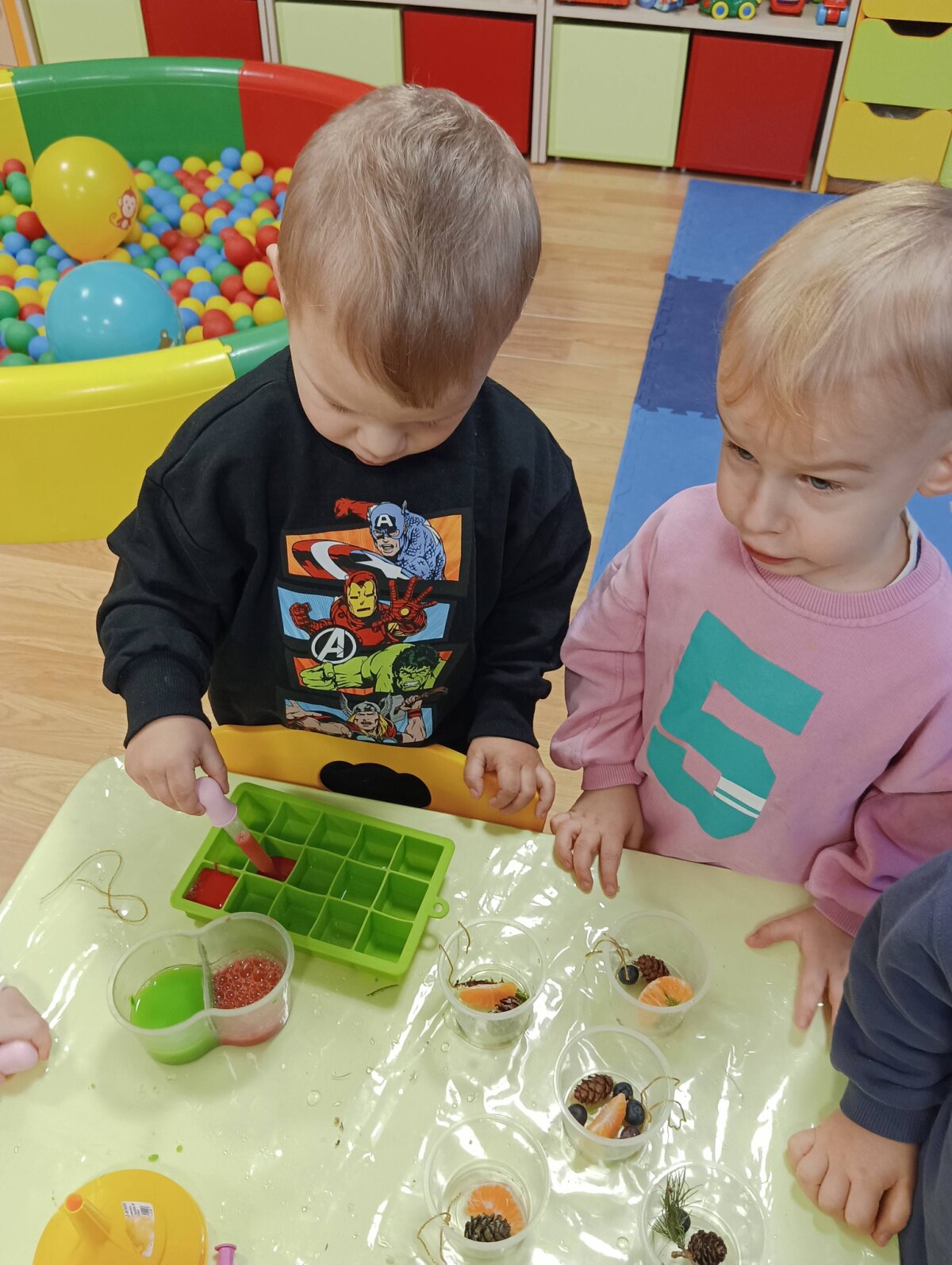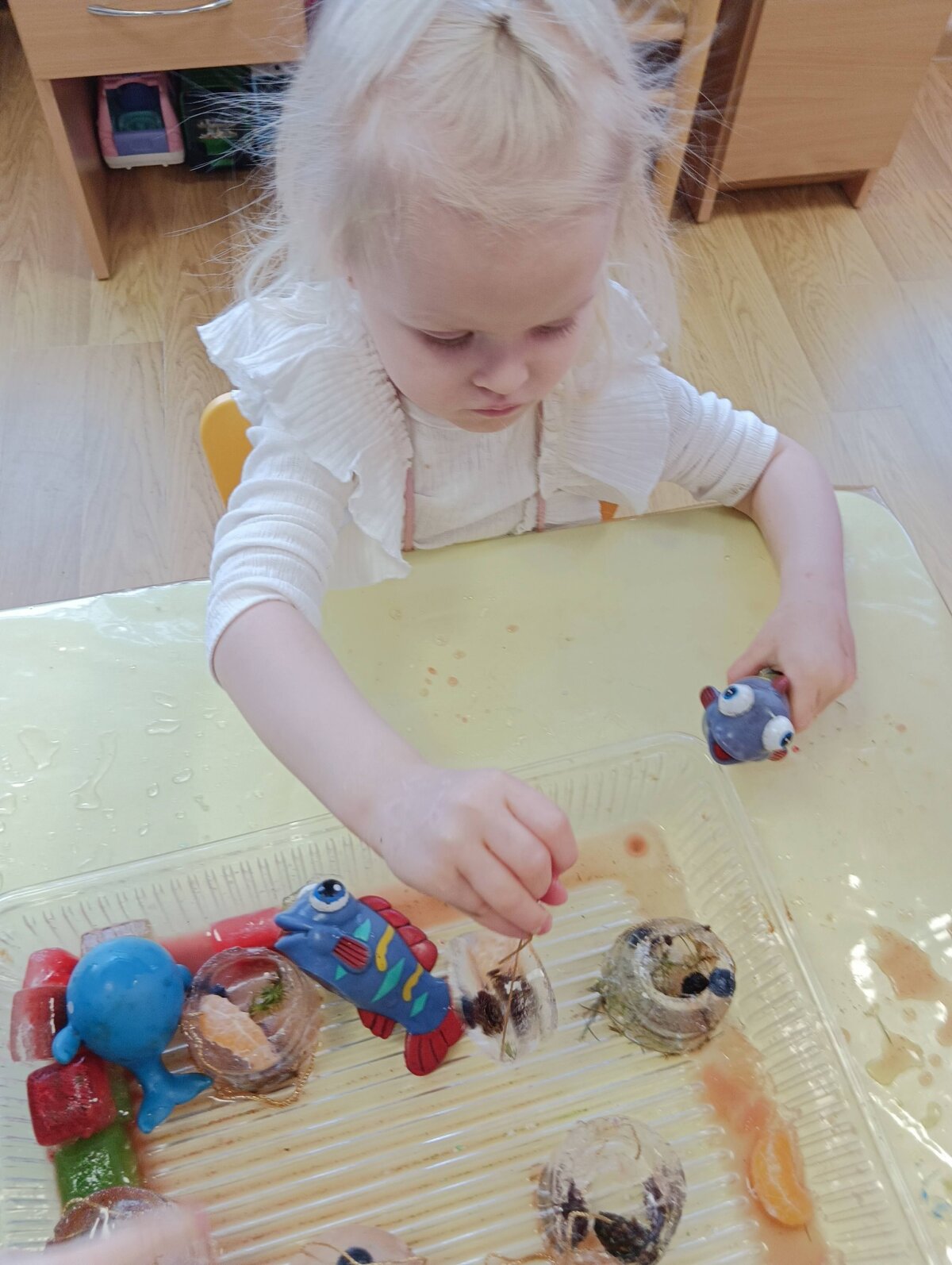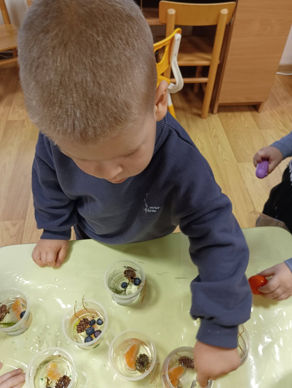 Į indelius dėliojo gamtinę medžiagą, pipetėmis lašino dažus ir viską užpylę vandeniu išnešėme į lauką.
